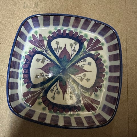 Royal Copenhagen Fajance skå/fad i stentøj med brun dekoration og mønster på indersiden. Skålen har let buede kanter og en lys glasur på ydersiden. Undersiden har stempel og håndskrevne numre. Velegnet som lille serveringsskål eller dekorativ skål i hjemmet.