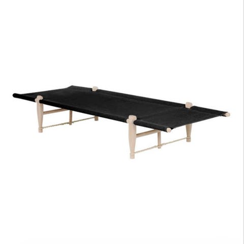 Stilren og smuk savbriks/daybed fra Skovshoved møbelfabrik, designet af Ole Gjerløv-Knudsen i 1962. Den er i ubehandlet bøgetræ, betræk i naturfarvet hørlærred og sisalreb i natur.
