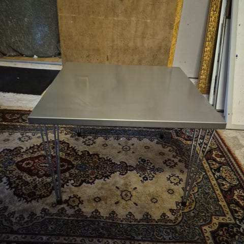 Dette lille bord måler 60x60x45 cm og har et sort metalstel og en kunststofplade, som er nem at gøre ren.
