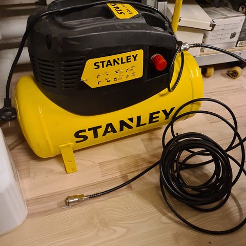 Stanley kompressor med en kapacitet på 6 liter, kun brugt 2 gange. Kompressoren har en maksimal tryk på 8,3 bar og kan anvendes ved temperaturer fra -10°C og op efrer. God kompakt kompressor der ikke vejer for meget og samtidig kan levere et godt lufttryk. Sælges uden slange og