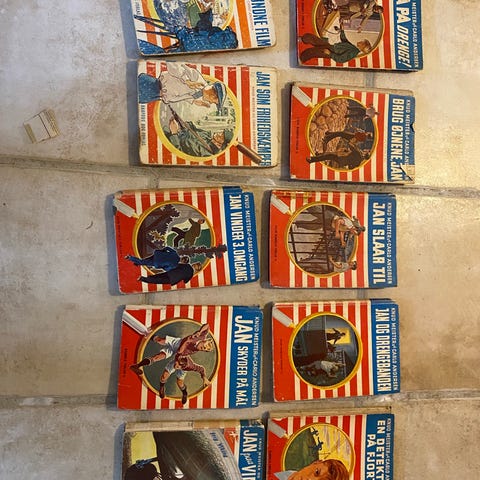 Jan-bøgerne bogsamling i de klassiske rødstribede udgaver. Serien består af hardback-bøger med blå ryg og røde/hvide striber på omslaget samt runde illustrationer på forsiden. Bøgerne er skønlitteratur for børn og unge og omhandler eventyr og oplevelser med hovedpersonen Jan. Sættet egner sig til samlere eller som komplet læse- og samlingsserie i hjemmet.