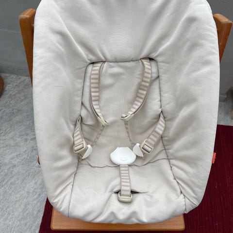 Stokke Tripp Trapp babysæde i brun med tilhørende puder i hvid og og beige. Alt fungerer som det skal.