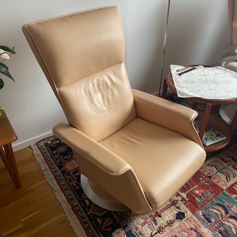 Nybetrukket af Klassisk Moderne Møbelkunst Bredgade 3. i september 2023 (kvittering haves) med Old American brunt læder inkl. behandling af stoleben. Er ikke anvendt siden og fremstår derfor som ny.