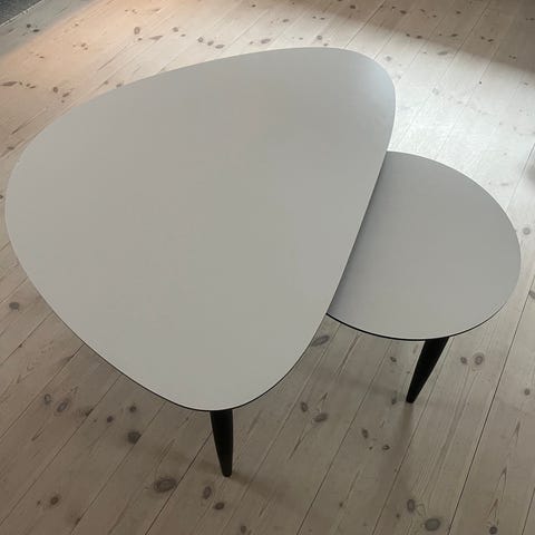Hvide borde med 2 farvede ben, i god stand, små brugsspor. Er henholdsvis 50 og 60 cm i diameter og 43,5 cm og 47,5 cm i højden.