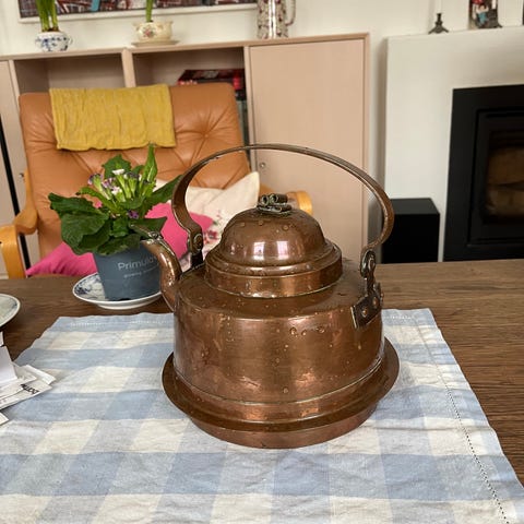 Kobber kedel med fast hank og låg. Kanden har klassisk, rund form med tud og hængslet hank, der går hen over toppen. Velegnet som dekoration eller til brug, hvor en større kobberkedel ønskes. Der ses brugsspor og mindre buler på siden, som vist på billederne.