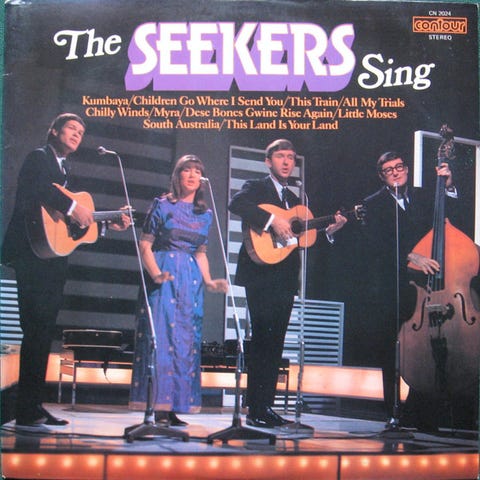 The Seekers vinylplade. Forside og bagside med sort-hvidt covermotiv og trykt tekst på bagsiden. Indeholder numre fordelt på side 1 og side 2 (trackliste fremgår af bagsiden). Egnet til afspilning på pladespiller, samling af vinyl eller som musikrelateret dekoration.