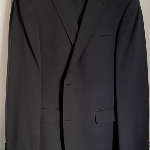 Jakke "TOBIAS SS" str. 102 Bukser "SILVIO" str. 106 Livv. 96 cm. og str. 102 NY. Jakke og bukser brugt 2 gange, det ene par aldrig brugt. Jakken har 2 slids bagpå. Bukserne har 2 baglommer og 2 skrålommer foran. Har et tilsvarende. sæt i sort