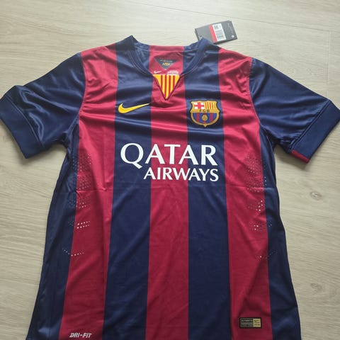 Nike FC Barcelona fodboldtrøje til herre i størrelse L. (Passer bedre til en M) Trøjen er kortærmet med rund hals og i de klassiske rød/blå klubfarver. For- og bagside har klublogo og sponsortryk. (Nike logo med tydlig sygning) Velegnet til fodbold, træning eller som supportertrøje. Fremstillet i let, åndbart materiale egnet til sport.