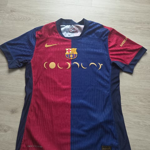 Nike FC Barcelona fodboldtrøje til herre i størrelse L. Trøjen er i klubbens blå/røde striber med klublogo på brystet og sponsortryk foran og bagpå. Fremstillet i Dri-FIT materiale, som er let og åndbart, egnet til fodbold og anden sport. Kortærmet model med rund hals og ventilationshuller i siderne for bedre luftcirkulation.