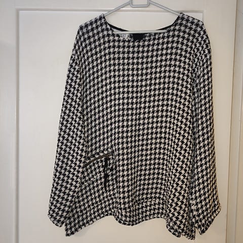 Masai bluse til kvinder i størrelse M. Blusen er sort med mønster og fremstillet i viskose. Den har en løs pasform med 3/4-ærmer og V-udskæring med lille krave. Velegnet som hverdagsbluse eller til mere afslappede anledninger.