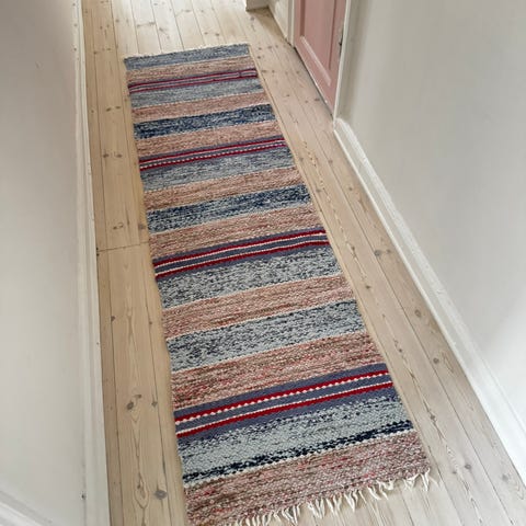 Håndvævet kludetæppe i bomuld med striber i forskellige farver. Måtten har frynser i begge ender. Mål 57 cm x 144 cm