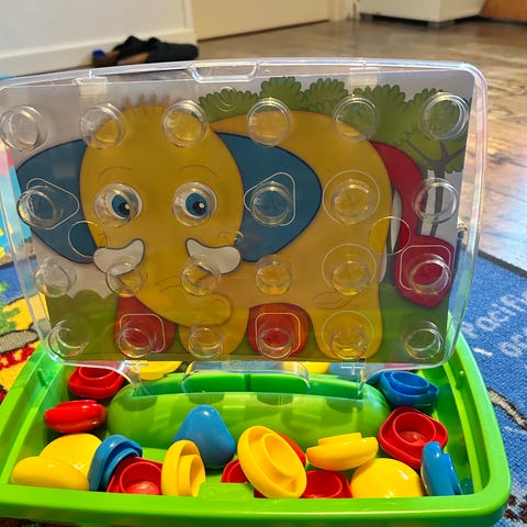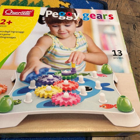 QUERCETTI legetøj med farverige klodser på plade. Egnet til små børn til sortering og stabling. Klodserne er i forskellige former og farver og kan sættes i hullerne på pladen for at træne finmotorik og farvegenkendelse.