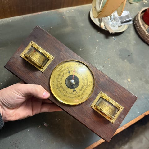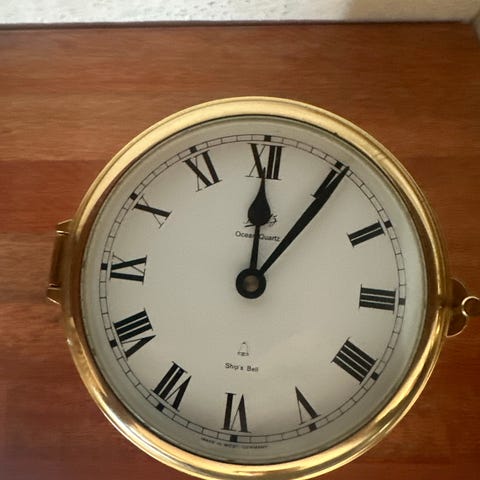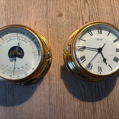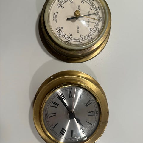 Schatz maritimt vægur og barometer i messing med hvid urskive og hvid barometerskive. Uret har romertal og klassisk maritim udformning, mens barometeret viser lufttryk og vejrudvikling. Sættet er egnet til ophængning indendørs, eksempelvis i stue, kontor eller bådmiljø, hvor både tid og vejrforhold ønskes aflæst. Uret er med batteri og med 2 revner i siden. Barometer er i ny stand