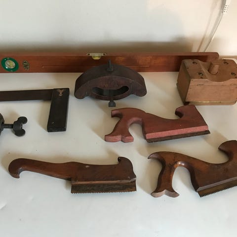 Hammer, træ skærekasse, store hæfteklammer, hånd sav,