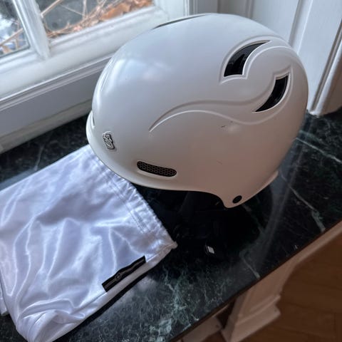 TSG hjelm med fuldt integreret visir i hvid farve. Hjelmen har lukket aerodynamisk design med mørkt frontvisir samt ekstra gennemsigtigt visir ved siden af. Indersiden er polstret med bløde puder og justerbar hagerem for fastspænding. Egnet til brug, hvor der ønskes fuld ansigtsdækning og vindbeskyttelse, fx ved cykling, skating eller lignende aktiviteter, hvor en lukket hjelm er relevant.