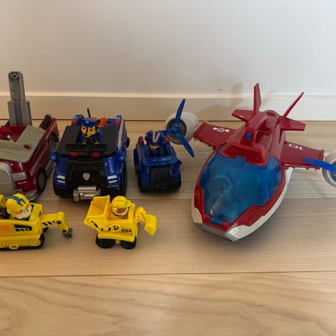 Paw Patrol sæt med flere køretøjer og figurer. Sættet indeholder blandt andet brandbil, politibil, motorcykel og andre køretøjer i plast med tilhørende små figurer. Legetøjet er velegnet til leg på gulv eller bord og kan bruges til rolleleg med Paw Patrol-universet. Farverne er primært rød, blå og grøn, og køretøjerne er i børnevenlig størrelse til små hænder.