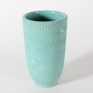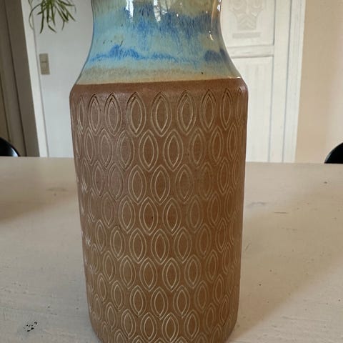 Rund vase med håndmalet, flerfarvet motiv i abstrakt stil. Vasen har en bred, kugleformet krop og en forholdsvis smal åbning foroven. Egnet som dekoration på bord, hylde eller gulv, med eller uden blomster. Passer ind i indretning, hvor der ønskes et farverigt og grafisk udtryk.