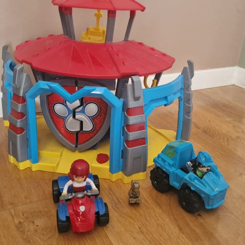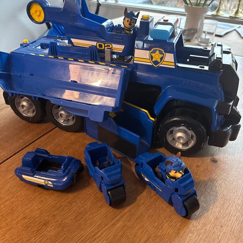 Paw Patrol legetøjssæt bestående af stor lastbil/transportkøretøj, flere køretøjer og flere figurer fra serien. Sættet indeholder blandt andet en stor rød og hvid lastbil(Paw Patroleren), der kan åbnes og bruges som legebase, samt forskellige patruljekøretøjer og tilhørende hundefigurer. Plastlegetøj egnet til rolleleg med Paw Patrol-universet, hvor børn kan genskabe redningsmissioner og historier fra serien.