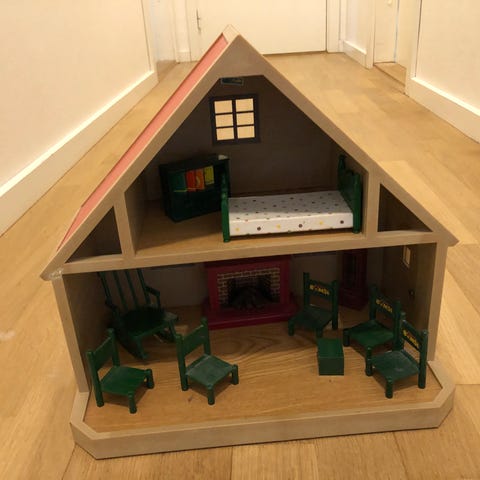 Velholdt sød dukkehusreol i hvid med lyserødt tag og vinduer. Reolen kan fungere som opbevaring til bøger/legetøj og samtidig som dukkehus.