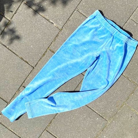 7: Blå og beige. Slidt. Fra Cappuccino. Angivet som str. L men jeg bedømmer som M. Indvendig benlængde ca. 67 cm. 0 kr.