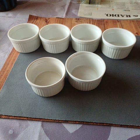 4 fejlfri ramekiner der står "6" under bunden. 9 cm i diameter og 4,5 cm høje.