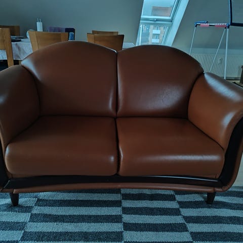 Pæn sofa gruppe fra 40'erne vil jeg tro. Består af 1 højrygget lænestol, 2 alm lænestole og 3 personers buet sofa. Sofa og 1 lænestol står opmagasineret. Billeder kan tages ved interesse. Skal ombetrækning.