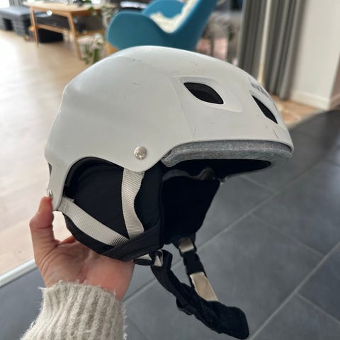 Skihjelm i hvid farve med faste ørebeskyttere og justerbar hagerem. Hjelmen har ventilationsåbninger i toppen samt polstret inderside for øget komfort. Velegnet til brug ved ski og snowboard.