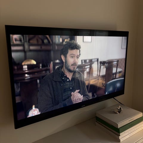 Samsung fladskærms-tv. Tv’et står på to fødder og leveres med fjernbetjening, som ses på billederne. Skærmen viser billede, men der ses lodrette striber/fejl i panelet på det ene billede, hvilket kan tyde på defekt skærm. Egnet som reservedele eller til reparation
