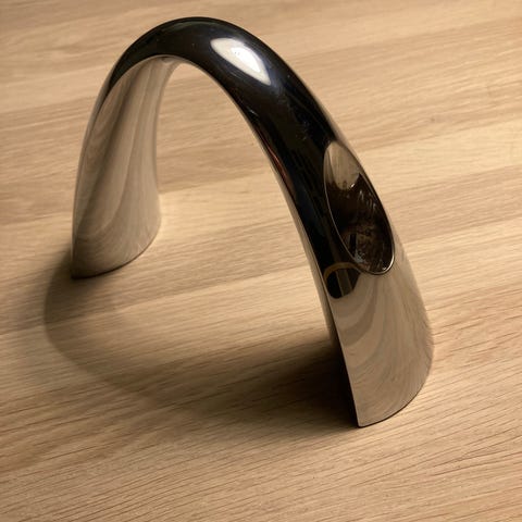 Stelton lysestage i sølvfarvet metal. Skulpturel bueformet lysestage med blankpoleret overflade. Undersiden har beskyttende belægning, som skåner underlaget. Egnet som dekorativt indslag på bord, reol eller vindueskarm i stue, spisestue eller entré.