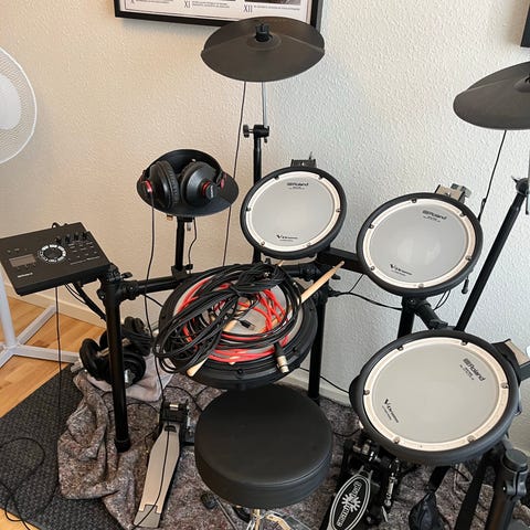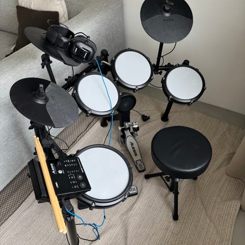 Elektronisk trommesæt med mesh-trommer og dobbeltpedal