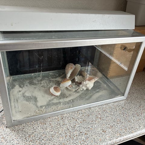 Med bundlag, pynt, planter, pumpe, filter, termometer og lys.