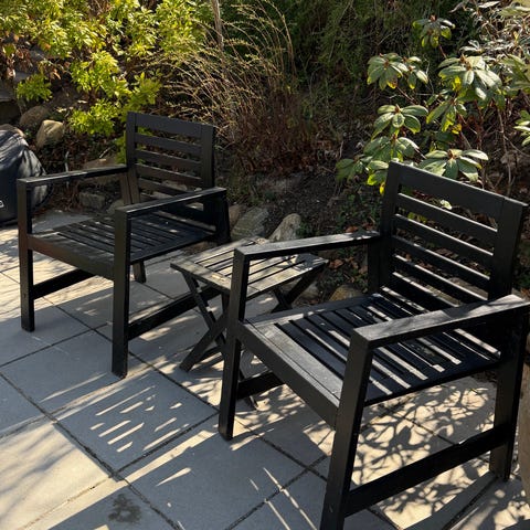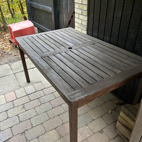 Havebord og havestol i træ i grå nuance. Sættet består af et lille bord med lameller og 2 stole med lamel-sæde og -ryg. Egnet til altan, terrasse eller mindre udendørsområder. Træet fremstår i en vejrpatineret grå farve.