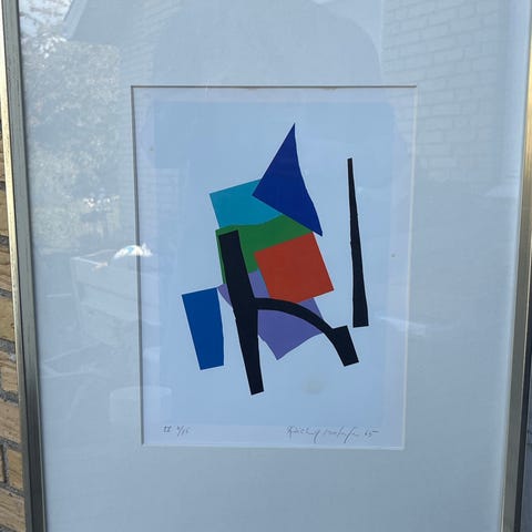 Litografiet er indrammet med hvid passepartout og ramme i malet træ.