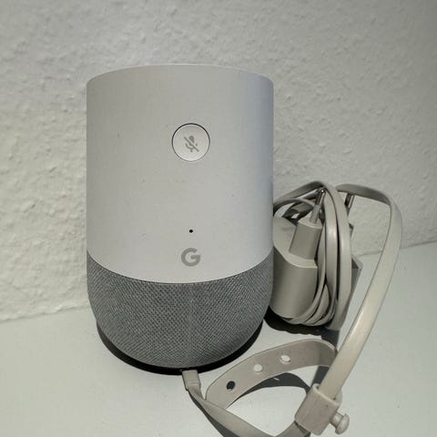 Google Home Mini smart højttaler i grå. Kompakt stemmestyret højttaler med stofbeklædt top og plastbund. Enheden kan bruges til afspilning af musik, styring af kompatible smart home-enheder, tidsindstillinger, vejrinformation og andre Google Assistant-funktioner. Tilsluttes typisk via Wi-Fi og strømforsynes med ekstern adapter (ikke synlig på billederne). Velegnet til brug i mindre rum som køkken, stue eller soveværelse.