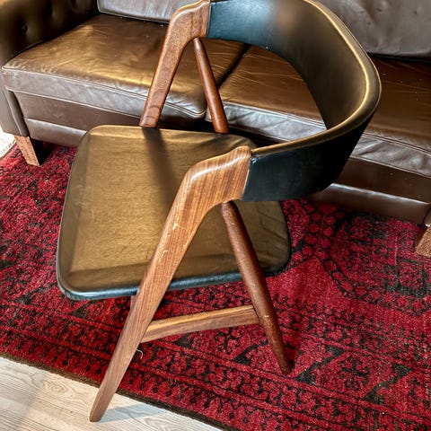 Armstol med stel af massivt teaktræ, sæde og ryg betrukket med sort scai. Designet af Thomas Harlev ca. 1958. Fremstillet hos Farstrup, model nr. 213. H. 72/43 cm. Fremstår i utrolig flot stand - ingen huller eller hakker.