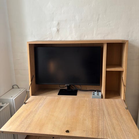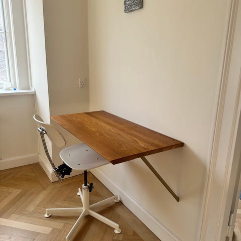 Sælger min flotte hjemmearbejdsstation fra Træfolk grundet flytning. Egetræ med linoliums bordplade, hænges på væggen og klappes op når det ikke er i brug. Der er står pt en 27" mac skærm, så det er der i hvert fald plads til. Koster 8.600 fra ny sælges for 5.000, eller kom med et bud.