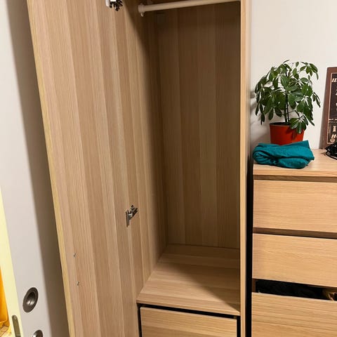 PAX skab fra IKEA i hvid med hylder, låger og sorte dørhåndtag. Har stået på mit badeværelse og har en smule pletter, som kan ses på de sidste billeder. Ses dog ikke når man har ting i skabet. Soklen, skabet står på på billedet, følger ikke med, men har været brugt for at undgå at blive skadet i bunden.