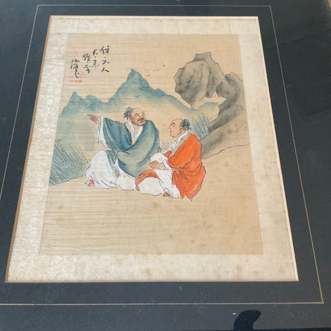 GENOPSLAG: Kinesisk maleri på papir med motiv af to fugle i et naturmiljø med klipper, grene og blomstrende grene i rødlige nuancer. Billedet er udført i traditionelle kinesiske penselstrøg med overvejende sorte, grå og hvide toner samt enkelte farvedetaljer. Øverst ses kinesisk skrifttegn og rødt stempel. Maleriet er monteret med kant, som kan ses på billederne. Velegnet til ophængning som vægdekoration i bolig eller kontor.