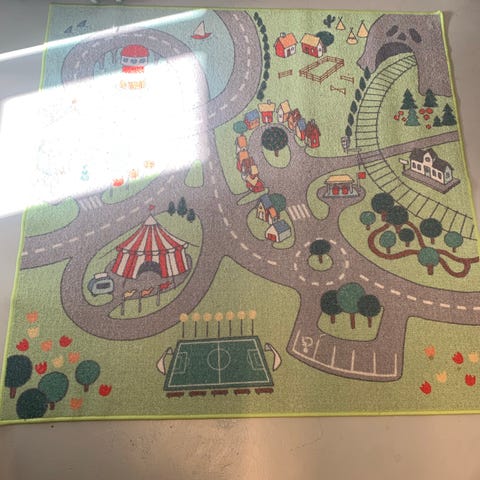 IKEA børnetæppe med vejbaner i flerfarvet design. Tæppet har motiv med sorte vejbaner, biler, trafiklys, skyer og andre små figurer på lys bund. Velegnet til børneværelse eller legeområde, hvor barnet kan bruge tæppet som underlag til leg med biler og figurer. Materiale og præcise mål fremgår ikke, men tæppet er rektangulært og beregnet til indendørs brug.