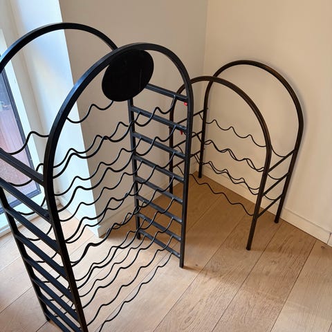 Vinreol i sort metal med buet top. Reolen har flere hylder med bølgeformede holdere, der kan rumme en række vinflasker. Velegnet til opbevaring og organisering af vinflasker i køkken, stue eller spisestue.