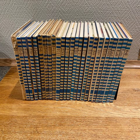 den klassiske Kim-serie med ensartet blå- og hvidstribede rygge samt forsider med illustrationer.