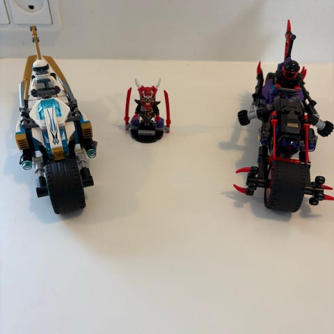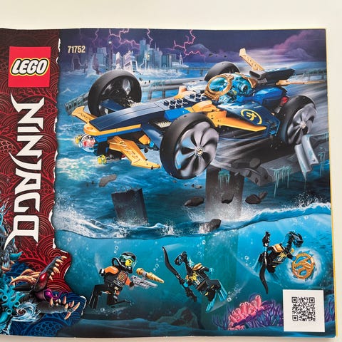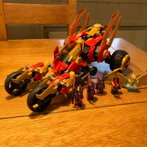 LEGO Ninjago sæt 71769 med terrængående køretøj og flere minifigurer. Sættet indeholder et orange og guldfarvet køretøj med store dæk og bevægelige dele samt flere figurer med våben og tilbehør.