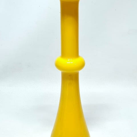 Mellemstor cylindrisk vase fra serien "Carnaby" med flad rand, med kugle på midten og trompetformet underdel, i opalhvidt glas med oceanblåt overfang.