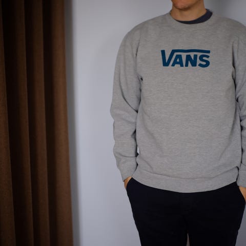 Sælger denne mørkeblå sweatshirt fra VanHeusen i størrelse M. Den er brugt, men stadig i god stand. Den består af 54% bomuld og 46% polyester.
