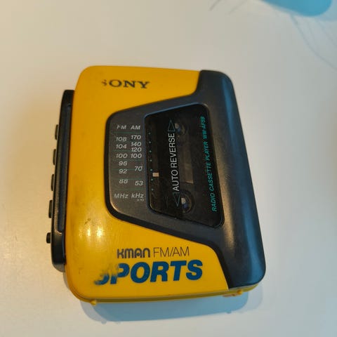 Retro walkman til afspilning af standard lydkassetter. Betjeningsknapper på siden til afspilning, stop, spoling m.m. På toppen findes tilslutninger til hovedtelefoner og strømforsyning. Egnet til afspilning af musik eller lydoptagelser fra kassettebånd via hovedtelefoner.