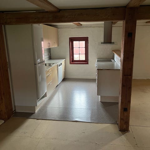 Køkken med hvide skabe (malet) og træbordplader.