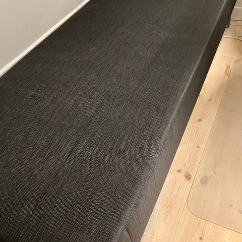 Solid og komfortabel boksmadras i sort stof, inkl. metalben i børstet stål. Madrassen har en stabil træramme og god støtte, og fungerer perfekt som enkeltseng eller halvandend-mands-seng.