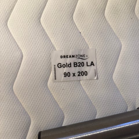 Jysk dreamzone Gold seng (200x90) i gråt stofbetræk. Tyk jysk gold latex topmadras. Sengen står på træben 15cm og har lamelbund under madrassen. Ca. 3 år gammel.