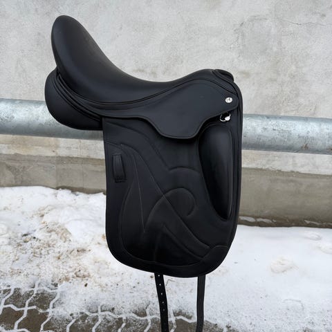 Her får du muligheden for at ride i det allerbedste: Italiensk dressursadel i mærket Prestige. Modellen er X Helen, lavet i sort læder. Sadlen giver dig perfekt støtte med dybt sæde og knæstøtter, velegnet til dressurridning. Undersiden har stoppede paneler og serienummer præget i læderet. Passer til hest og rytter til klassisk dressurbrug. 16" Justérbar bom. Nyprisen er i dag 33.750 kr. så dette er absolut en fair pris. Har kun været brugt til korte skovture og har et enkelt lille slidmærke på den ene inderflap. Er du den heldige køber?