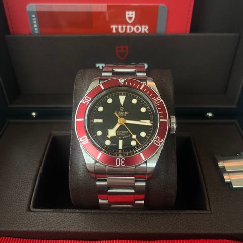 Sælger mit flotte Tudor Heritage Black Bay 41mm (79220R) med rød bezel og sort skive. Uret har den karakteristiske smiley-dial og rose-logo, som Tudor kun producerede i en meget begrænset periode.